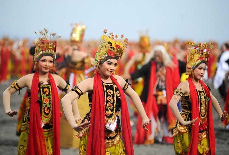 BANYUWANGI, Indonesia, Oct. 27 (Xinhua) — Performers in traditional costumes staged Gandrung, a popular mass dance in Banyuwangi, East Java, Indonesia, on Saturday to celebrate the Gandrung Sewu Festival.
