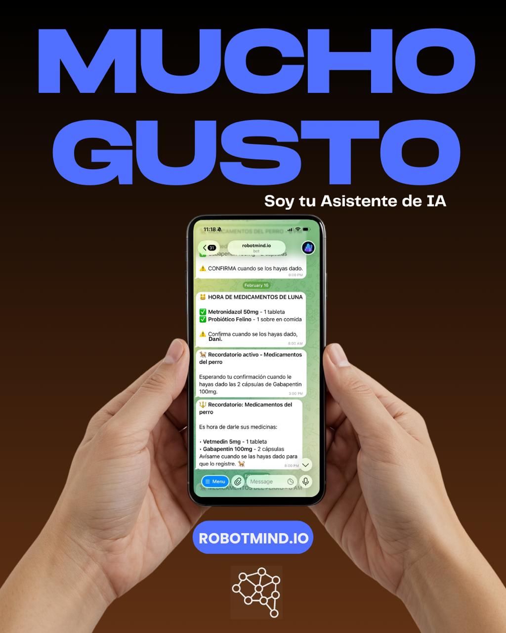 RobotMind se conecta a más de 20 herramientas que la mayoría de la gente ya usa: Gmail, Google Calendar, WhatsApp, Telegram, Slack, Notion, GitHub, Google Drive, entre otras. El motor detrás es Claude Opus y Sonnet de Anthropic, lo que le permite entender instrucciones complejas y resolver problemas paso a paso sin necesidad de guiarlo de la mano.